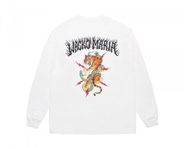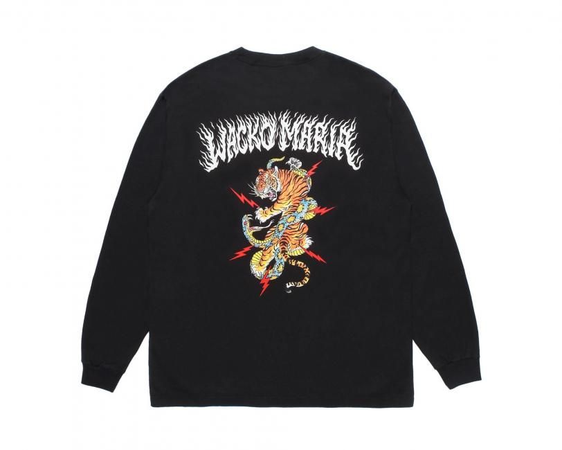 ワコマリア オリジナルの製品洗い加工を施したヘビーウエイトボディに TIM LEHI(ティム・リーハイ)によるWACKO MARIA のグラフィックロゴを胸に配置、バックには虎とサンダーボルトを掛け合わせたグラフィックをプリントで配しています。