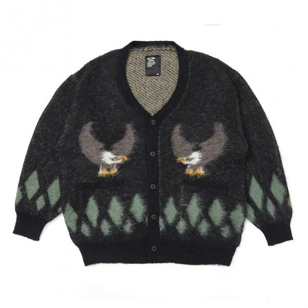 フロントの両胸にイーグルのグラフィックを配したモヘア混ニットカーディガン。