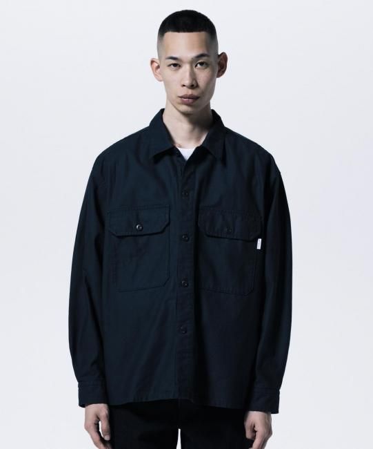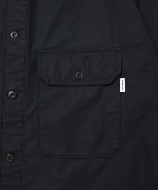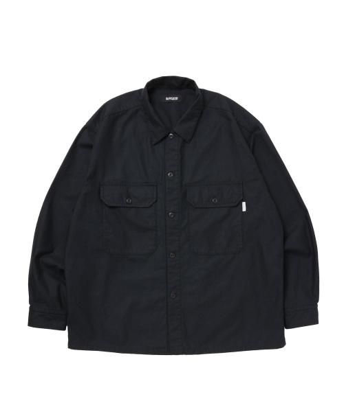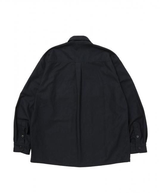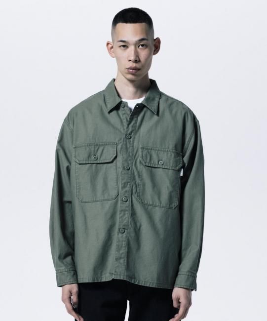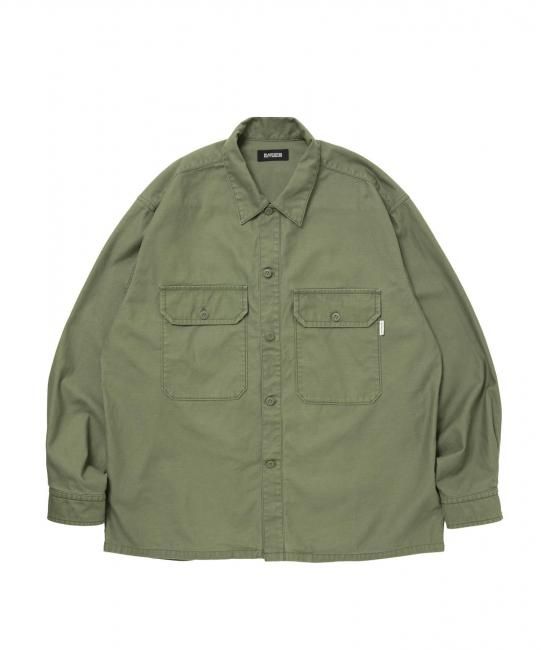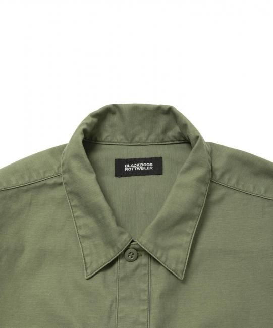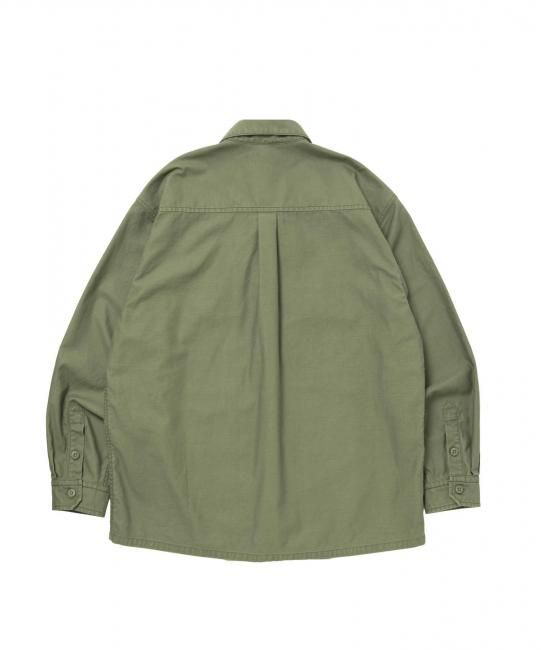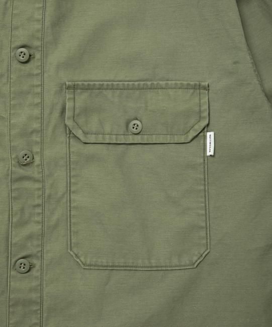 ムラ糸を使用したバックサテン生地を顔料で染め上げ、バイオ加工を施すことでオリジナルの加工感を表現したミリタリーシャツです。